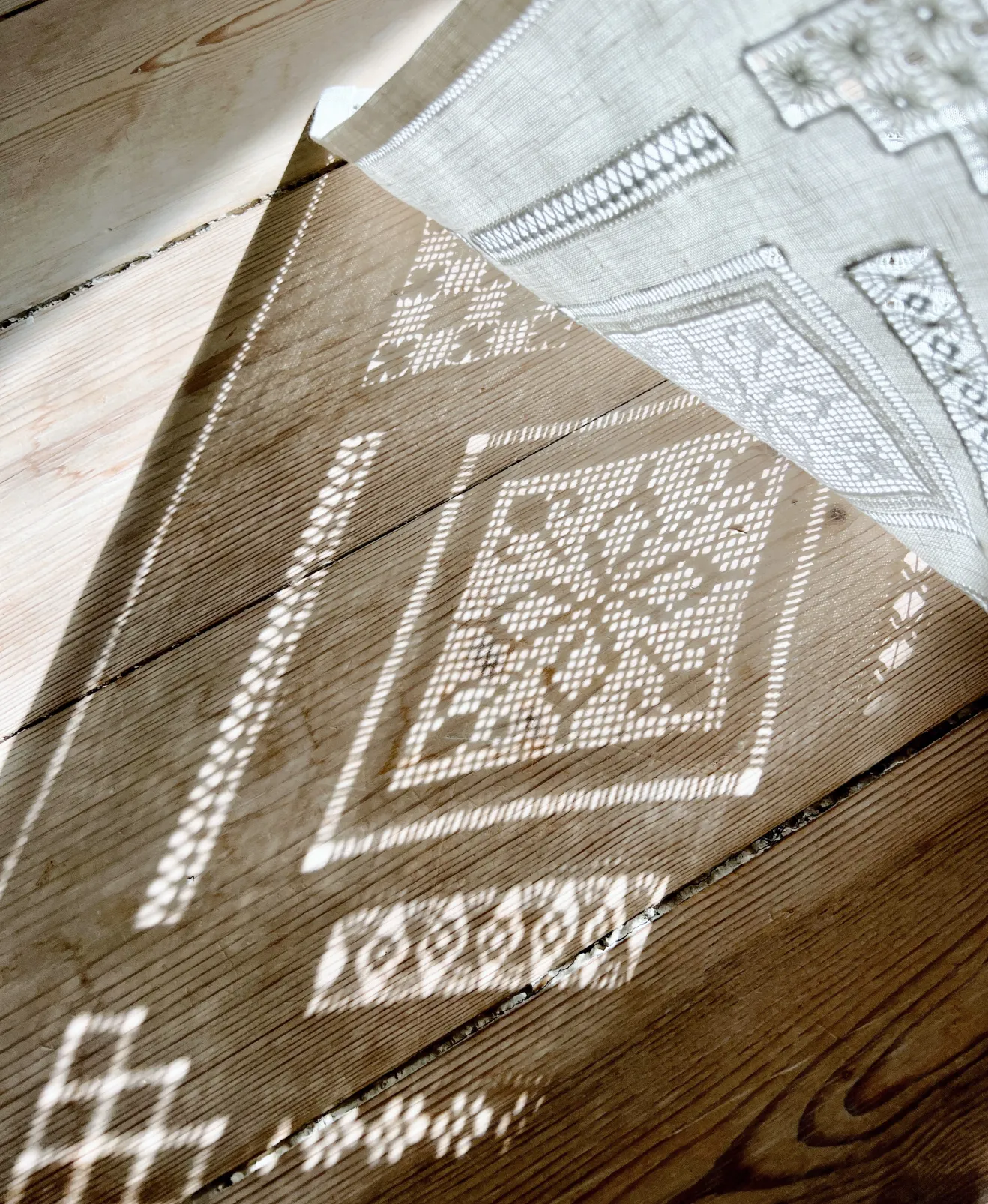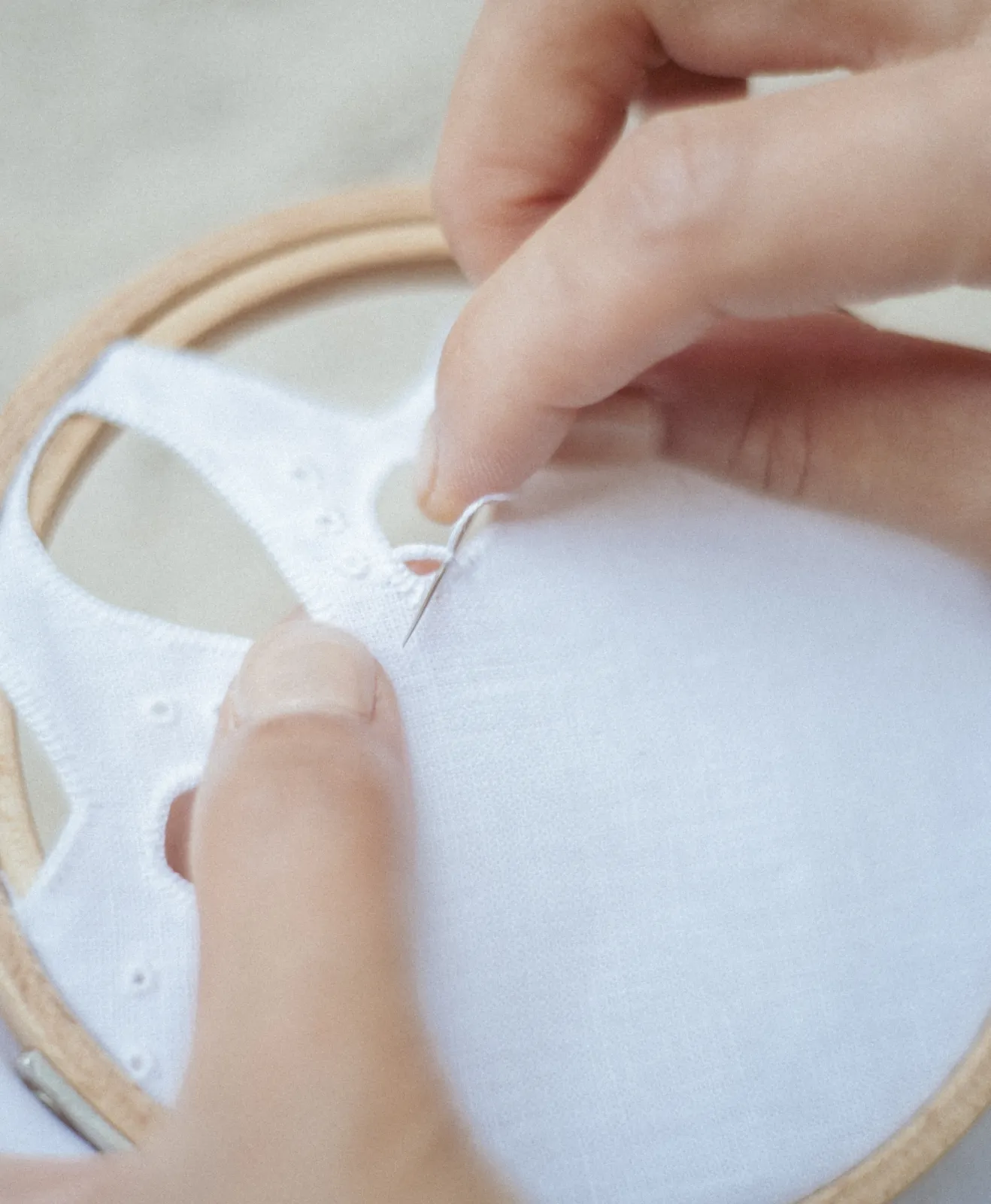 元々は西洋の王室貴族の洋服やハウスリネン、教会の儀式で使われる祭壇幕等に、権力を誇示する目的で用いられたと言われます。18世紀以降には大量の綿が流通し、一般家庭でも気軽に白糸刺しゅうを刺せるように。最盛期を迎えた18-19世紀には、多くの技術が発展を遂げましたが、近年では本場・ヨーロッパでも技術の担い手が不足し、消滅の危機が訪れています。現代において白糸刺しゅうに挑戦することは、カルチャー存続の一端も担っています。