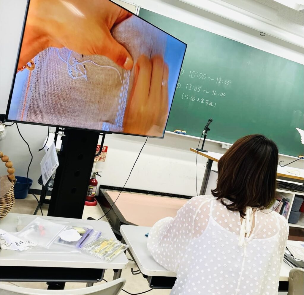 学校なので設備も良くて、大きなスクリーンに手元を写しだす機会を設置してもらったり、いつもすごくよくしてくださる編集部の方にもお手伝いいただき、生涯学習のスタッフの皆さまの万全のサポートの元、つつがなく2回のワークショップを終了することができました。