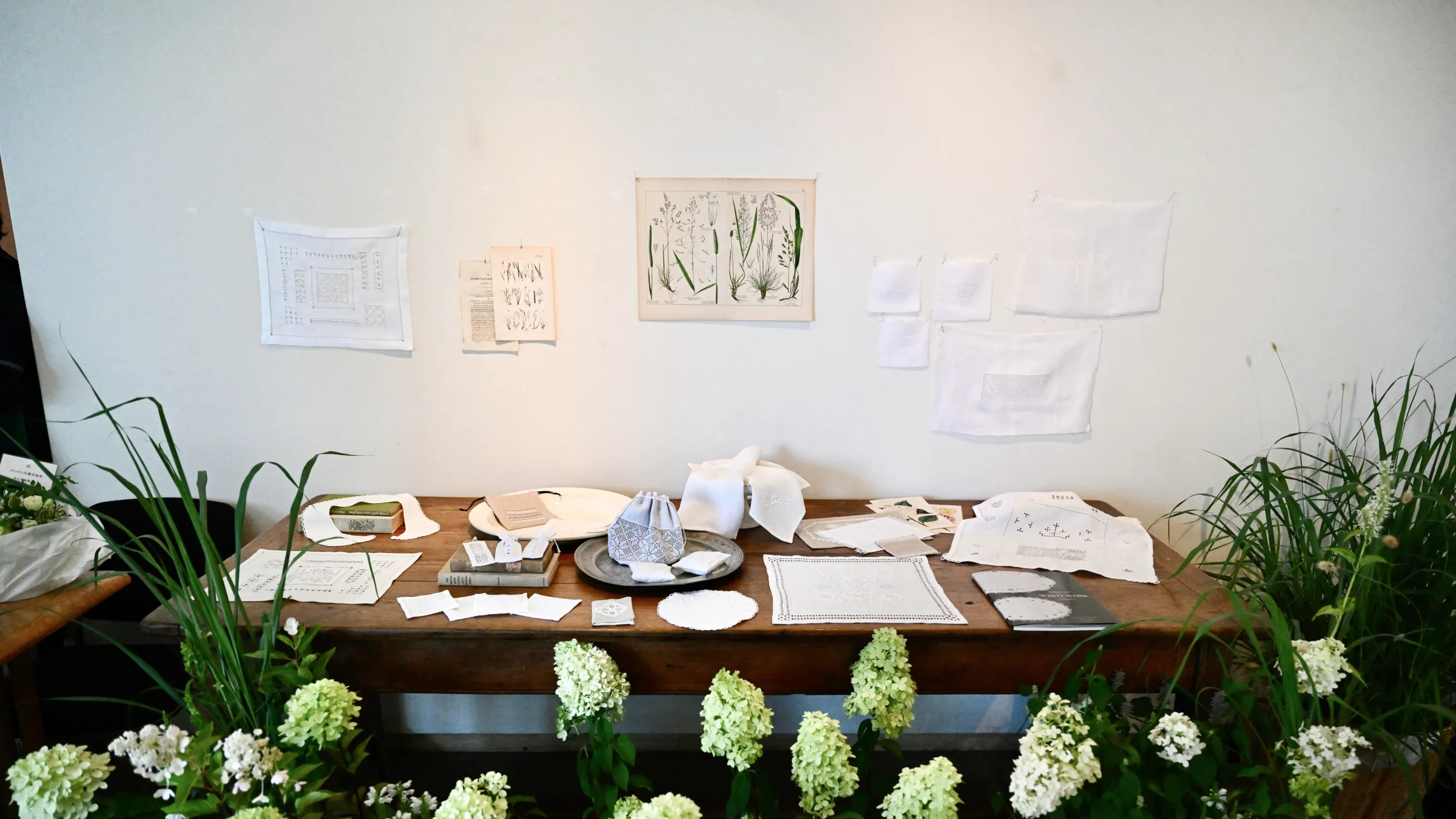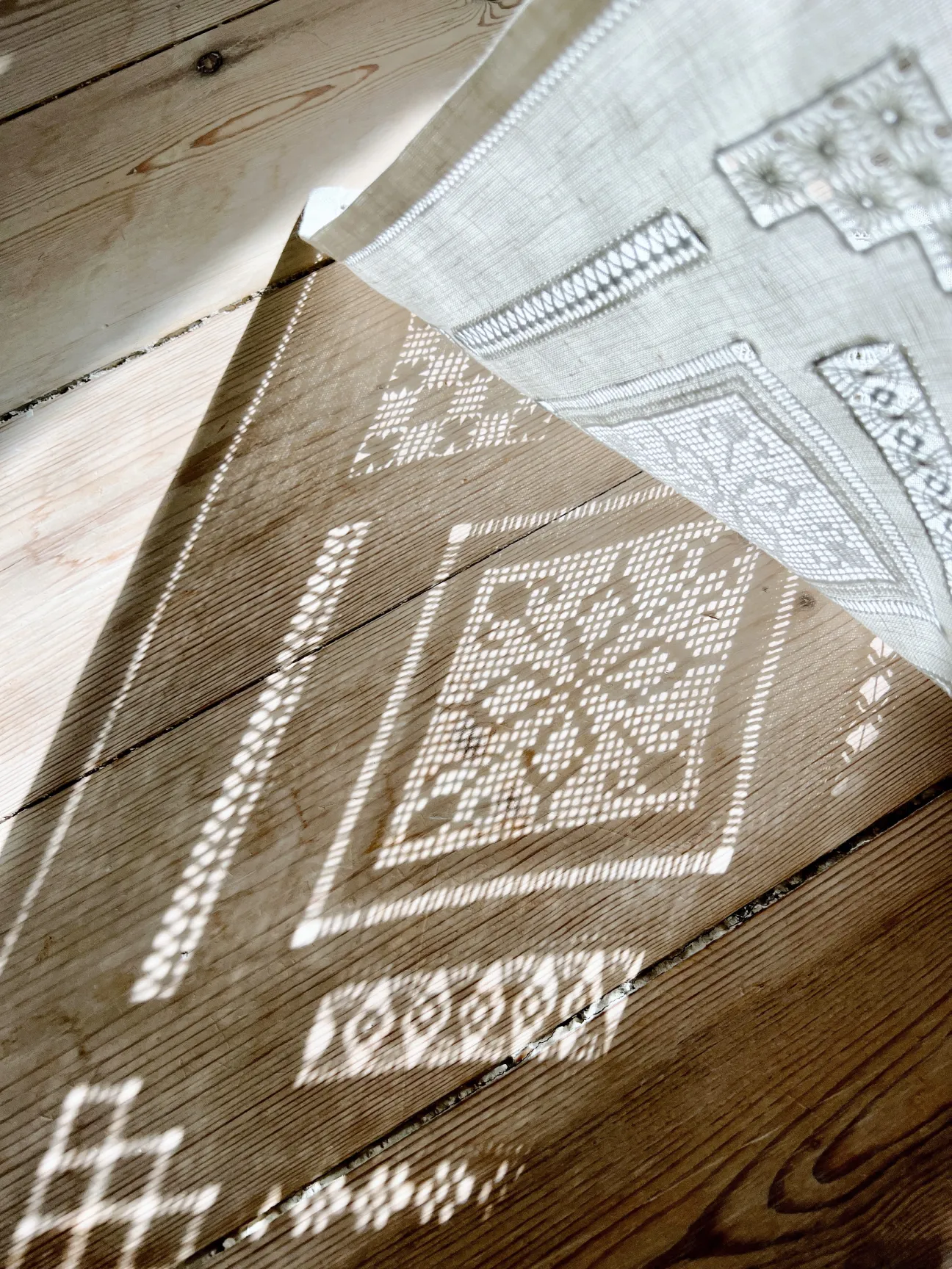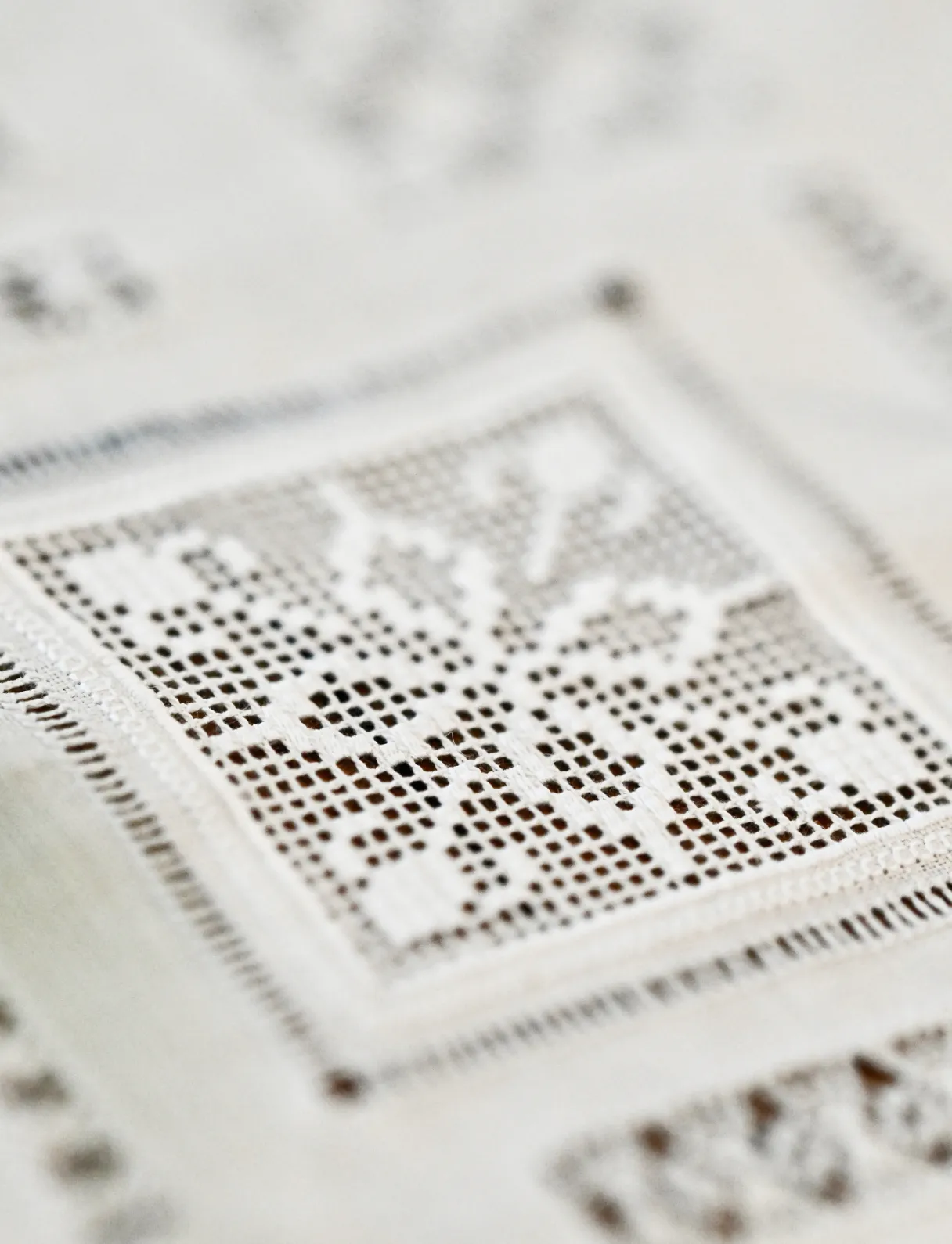 さまざまなホワイトワークでよく使われるドロンワーク。布から織り糸を抜いてスペースを作り、中にかがり模様を入れます。マス目をダーニングステッチや七宝かがりで埋めるものや、長細く枠を作って連続した模様を入れることもあり、自由度の高い技法です。